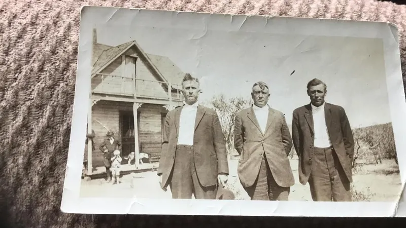 Tom Ferris is in the middle. Archie Grey is on the right. Archie is Tom's half brother. Albert Ferris , left, is Tom's brother . Their mother Amanda Jane Stevens Ferris Grey, married Mr. Grey after Tom's father, George Washington Ferris died. Archie came with Tom and Ada on their trip to Okalhoma from Texarkana, as did Ada's younger brother, Scott Spear.