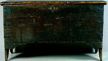 William Brewster was elder of the Pilgrim church in Scrooby, England, Leiden, Holland and Plymouth, Massachusetts. They sailed on the Mayflower in 1620, a tiny sailing ship. William brought this chest with him. His Plimoth Pautuxet Museum house (replica) has carved furniture from England, a dirt floor, a rope bed with curtains around it and several books, some in Latin. His will lists over 400 books. He taught Latin while living in Holland. His grandson, Isaac Allerton, lived with him and was tutored by him before entering Harvard College. William donated some of his books to Harvard. Isaac was in the first graduating class of 1650.
